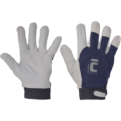 • kesztyű finom bárány színbőr tenyérrel, kék pamutszövet kézfejjel, tépőzáras mandzsettával